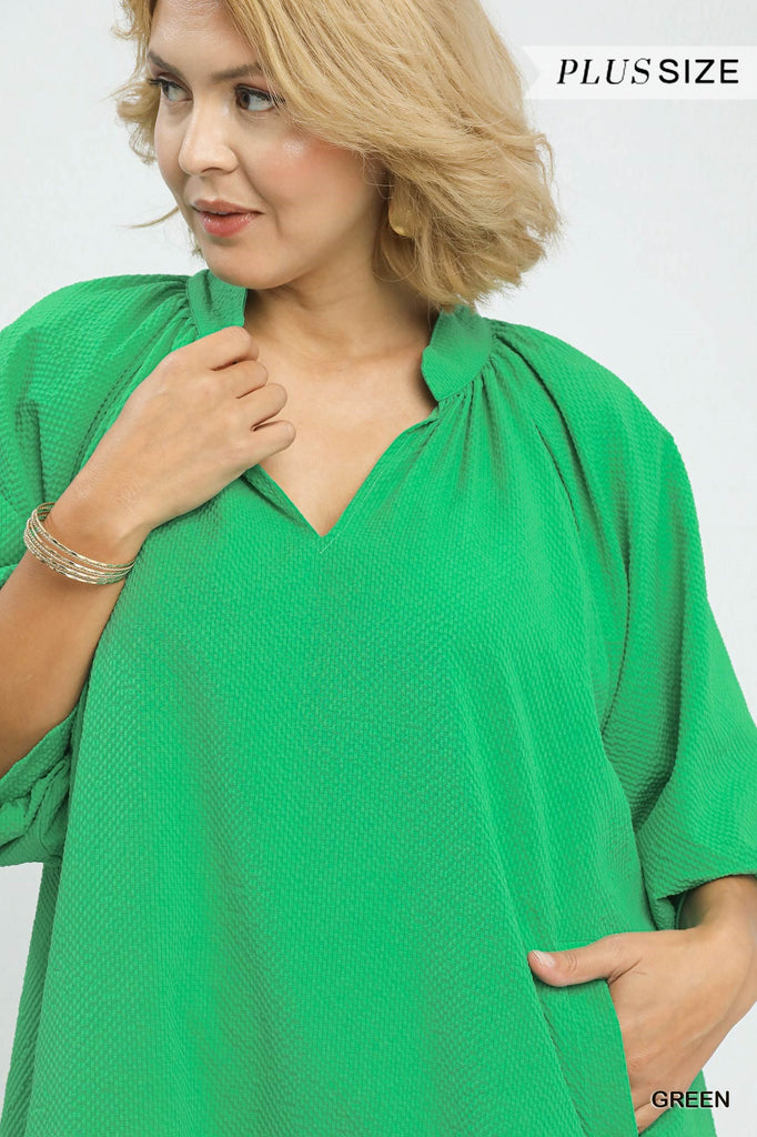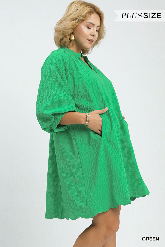 Key Features• V-neckline with soft scalloped trim• 3/4 length balloon sleeves• Side pockets• Lined