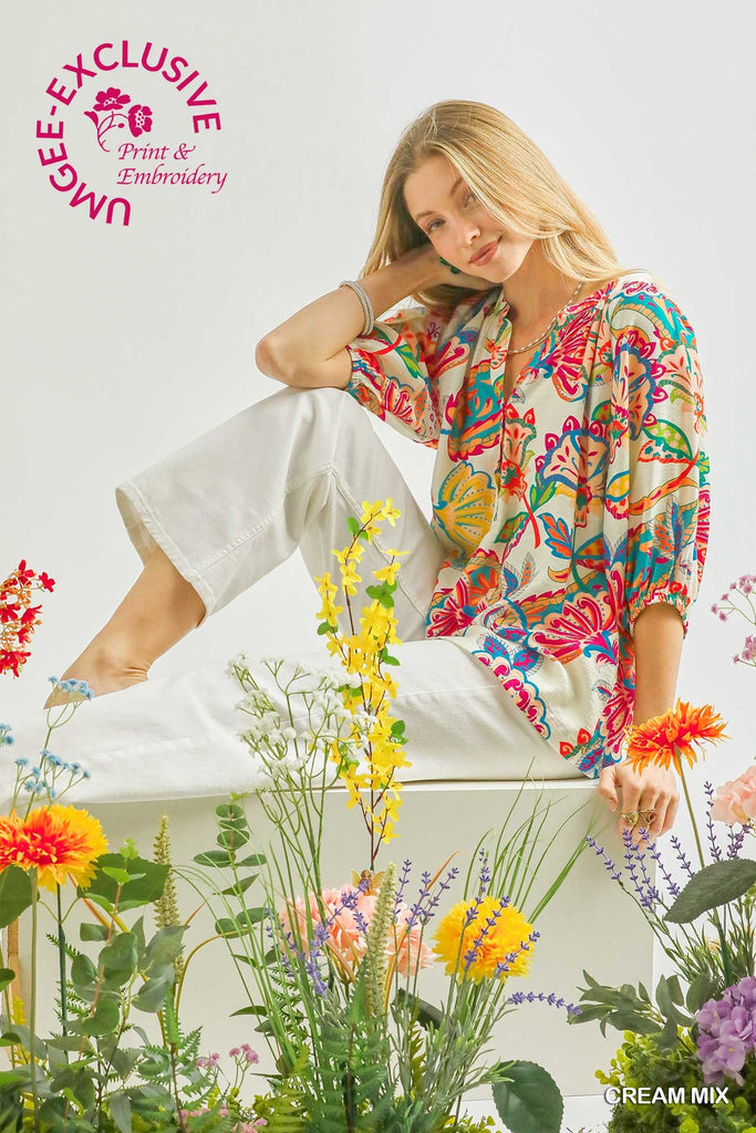 Key Features• V-neckline with gathered pleat accents• 3/4 length sleeves with elastic cuffs• Mid button down• Not Lined